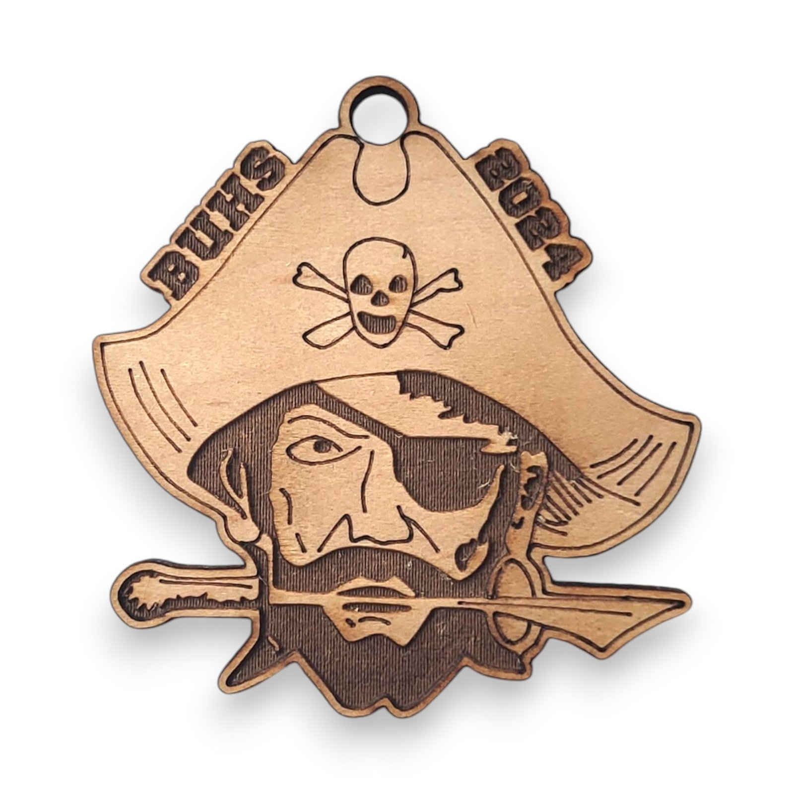 Celebrate school spirit with our Buckhannon-Upshur High School Ornament, featuring the iconic mascot! Measuring 3.5 inches in diameter, this vibrant ornament showcases the school name and a striking depiction of the mascot, complete with a skull n crossbones pirate hat, a sword held between the teeth, and an eye patch.