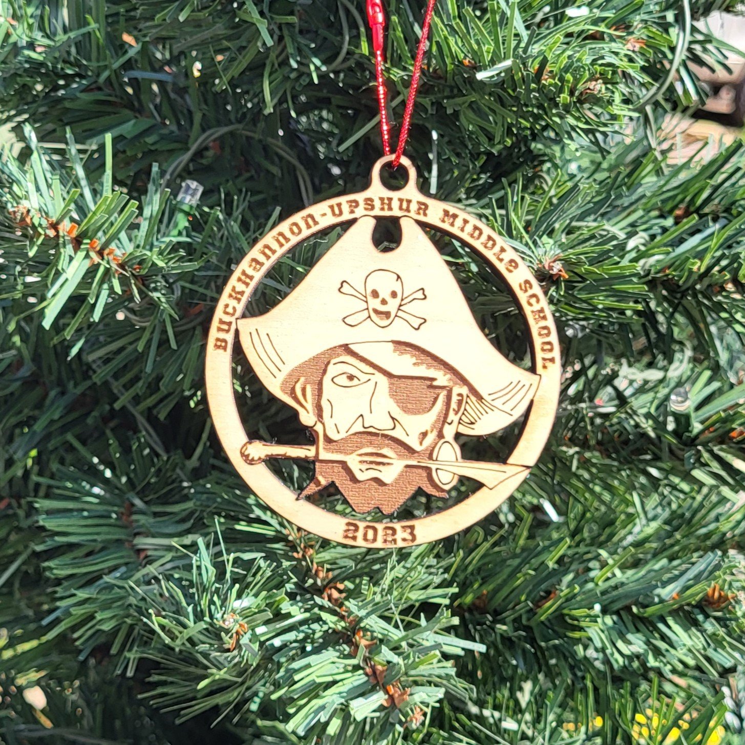 Celebrate school spirit with our Buckhannon-Upshur Middle School Ornament, featuring the iconic buccaneer mascot! Measuring 3.5 inches in diameter, this vibrant ornament showcases the school name and a striking depiction of the pirate mascot, complete with a pirate hat, a sword held between the teeth, and an eye patch.