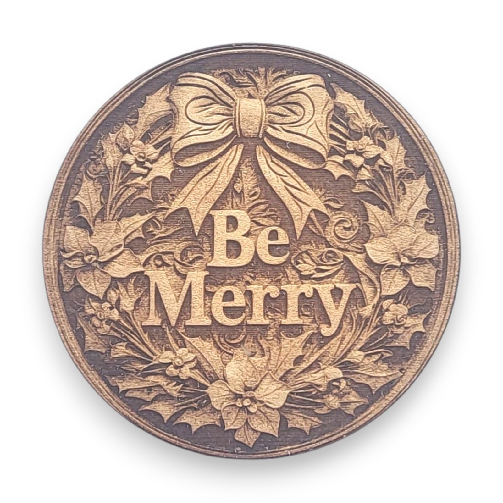 Spread holiday cheer with this 3.5-inch round wooden ornament, featuring an intricately engraved Christmas wreath adorned with flowers and a large ribbon bow, with the joyful words BE MERRY elegantly displayed in the center. This charming ornament brings festive spirit and happiness to your holiday decor.