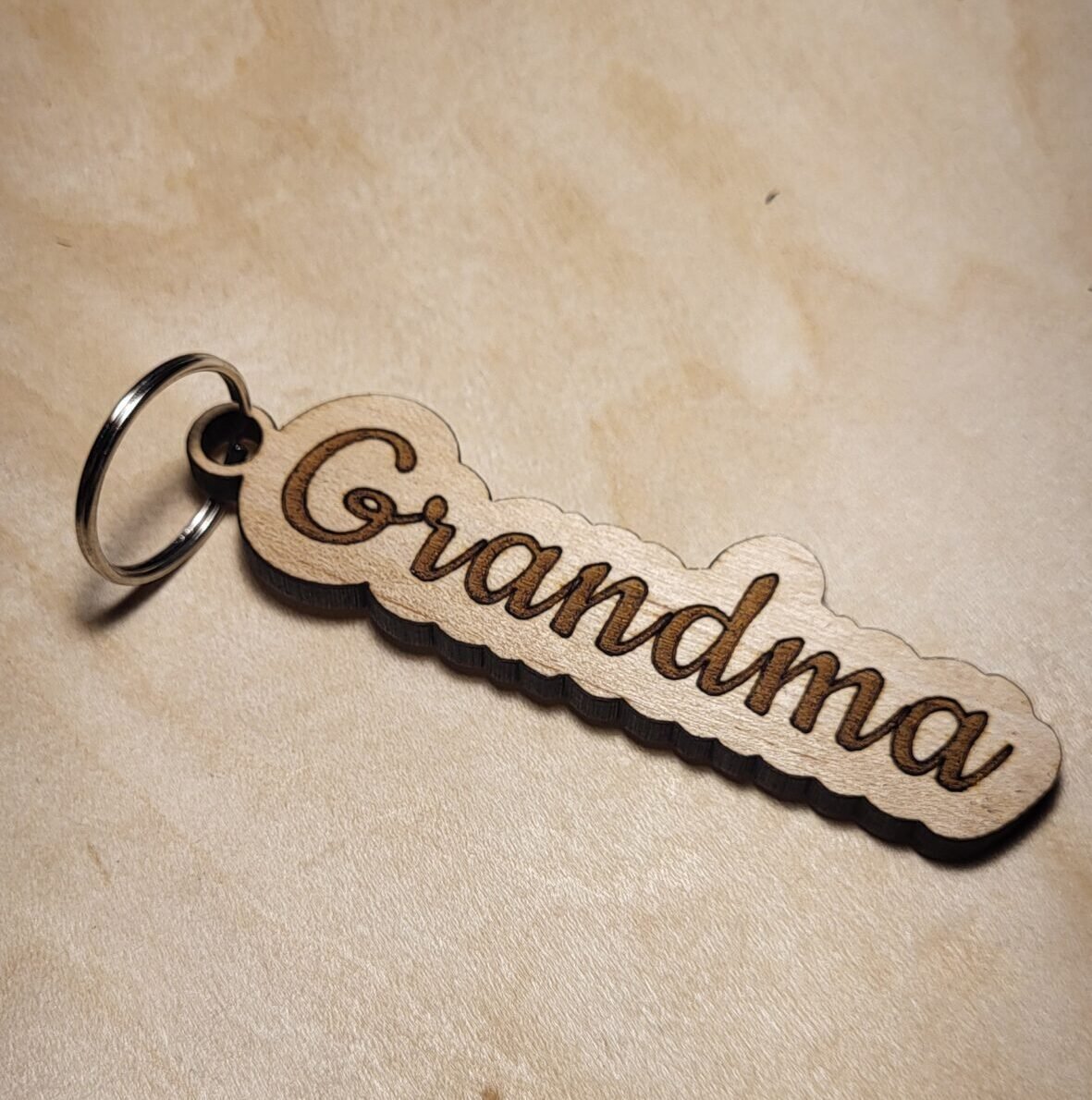Family Title “Grandma” Keychain Highlights: Wooden Material Engraved Title Metal Keyring Ideal for Grandmas of all ages, shapes, sizes, colors, temperaments, and attitudes Beautiful scrolled and elegant font, yet readable Perfect as a thoughtful, personalized gift 2.5 inches in length