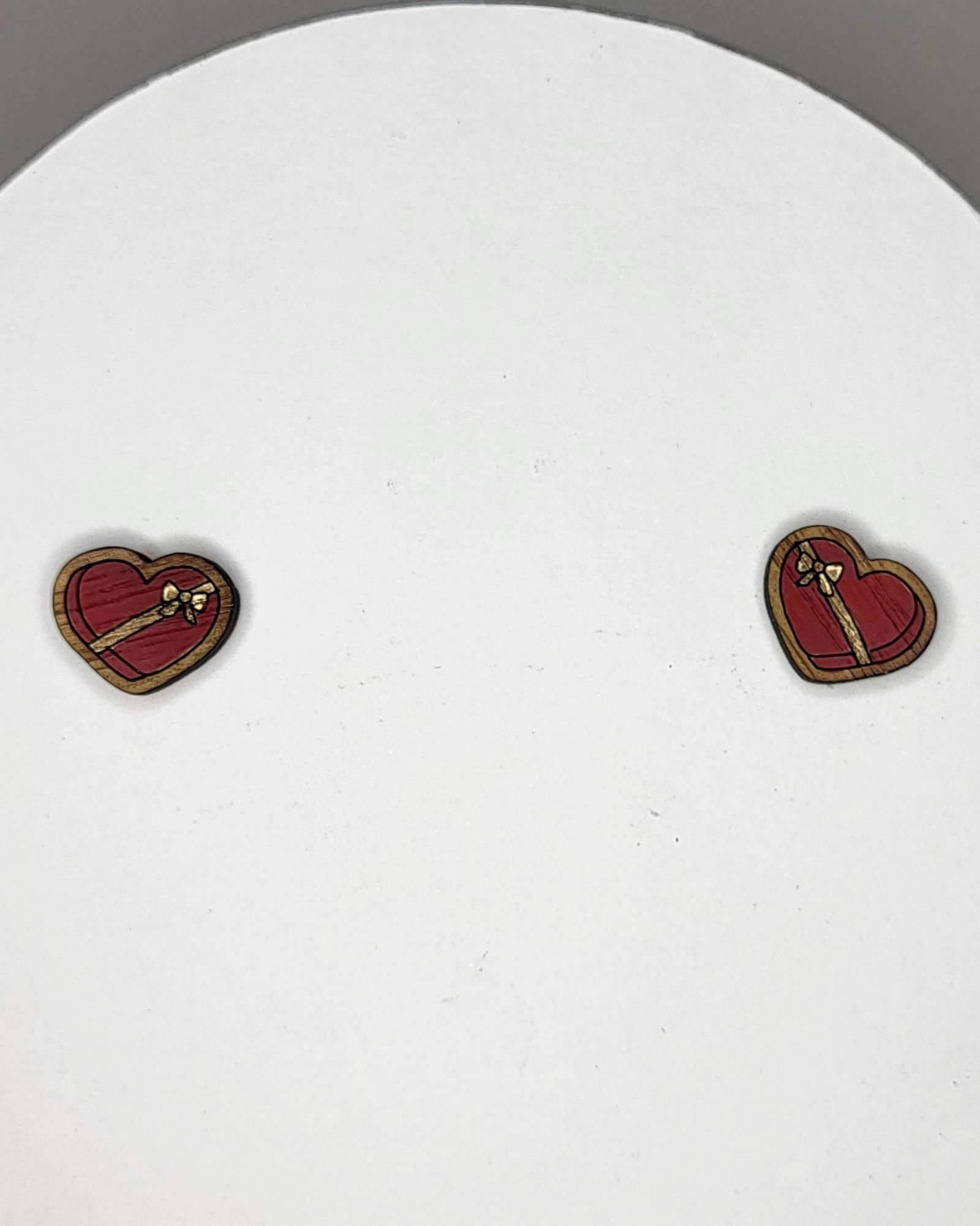 Heart Box Wrapped in Ribbon Stud Earrings – Hand-Painted Wooden Jewelry