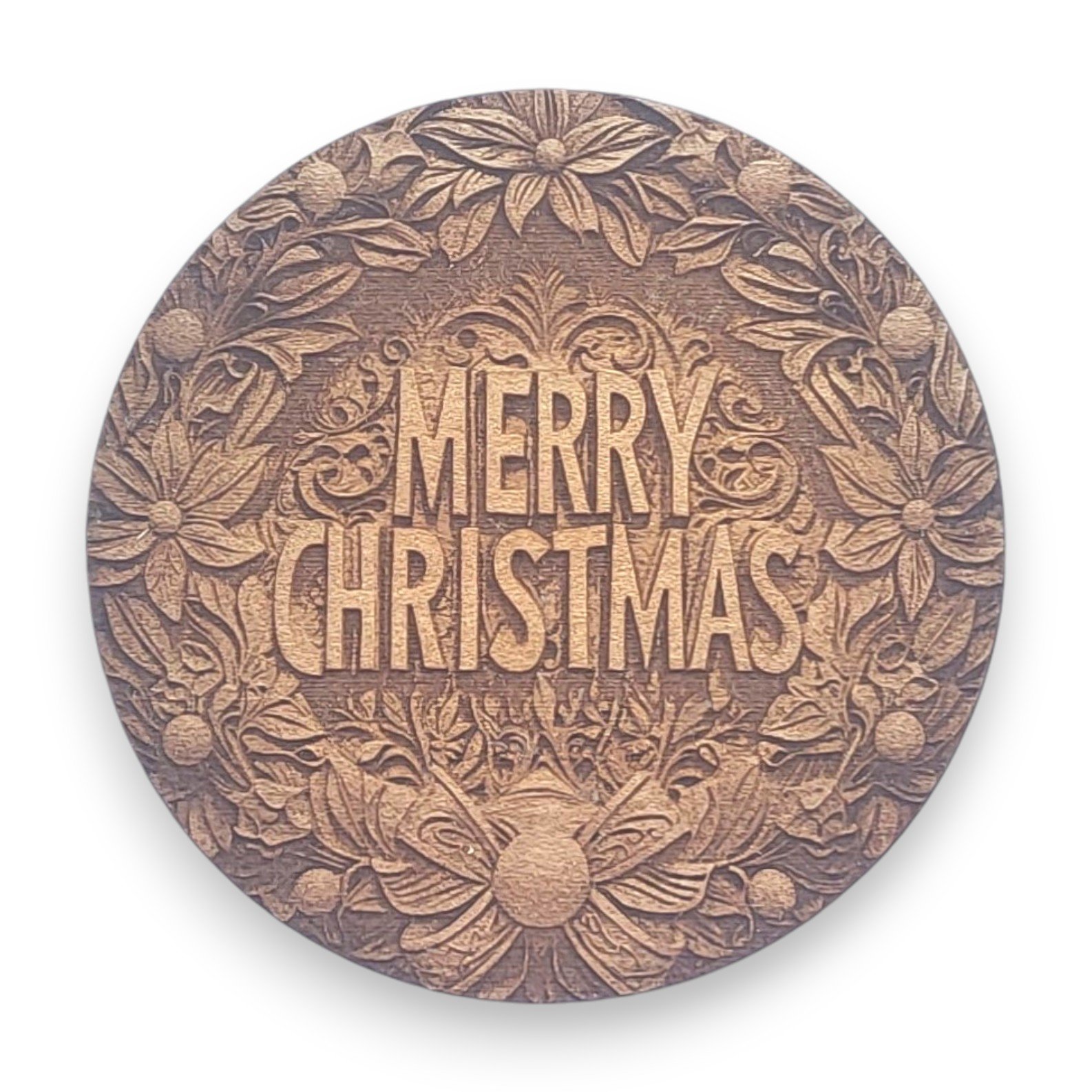 Add a touch of festive elegance to your holiday decor with this 3.5-inch round wooden ornament, featuring a beautifully engraved wreath with the words Merry Christmas at the center and a charming bow at the bottom. This ornament brings timeless holiday cheer to your tree or festive displays.