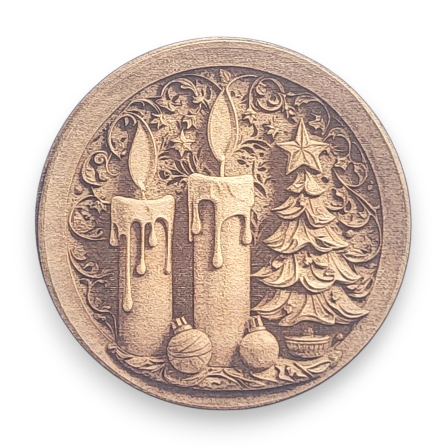 - Christmas Candle and Tree Design: The detailed engraving showcases a classic Christmas candle, symbolizing warmth and light, paired with a Christmas tree adorned with a shining star at the top.