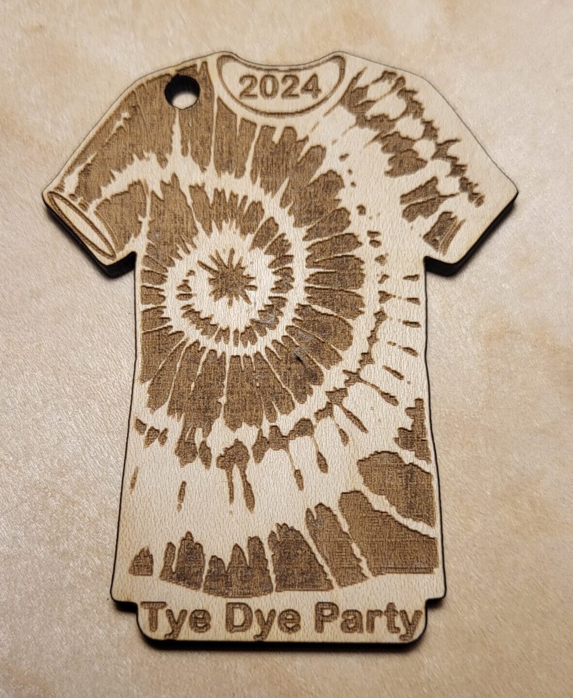 Tye Dye Party T-Shirt Keychain Highlights: Wooden Material Engraved year and phrase “Tye Dye Party” Year of keychain received will be the current year Metal Keyring Ideal for a party favor for get togethers or fund-raisers! Beautiful clear and readable font Perfect as a thoughtful, personalized gift 3 inches in length