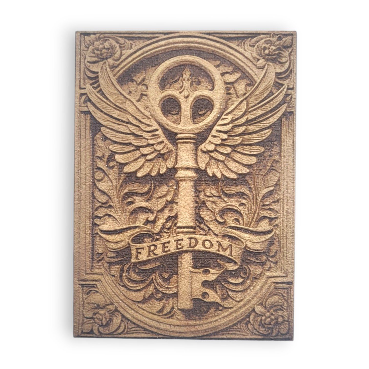 Embrace the timeless value of freedom with this 3.5-inch rectangular wooden ornament, featuring an intricate engraved design of an ancient key with wings and a scroll that reads FREEDOM. A beautifully detailed relief plaque that adds a meaningful and vintage touch to your holiday or year-round decor.