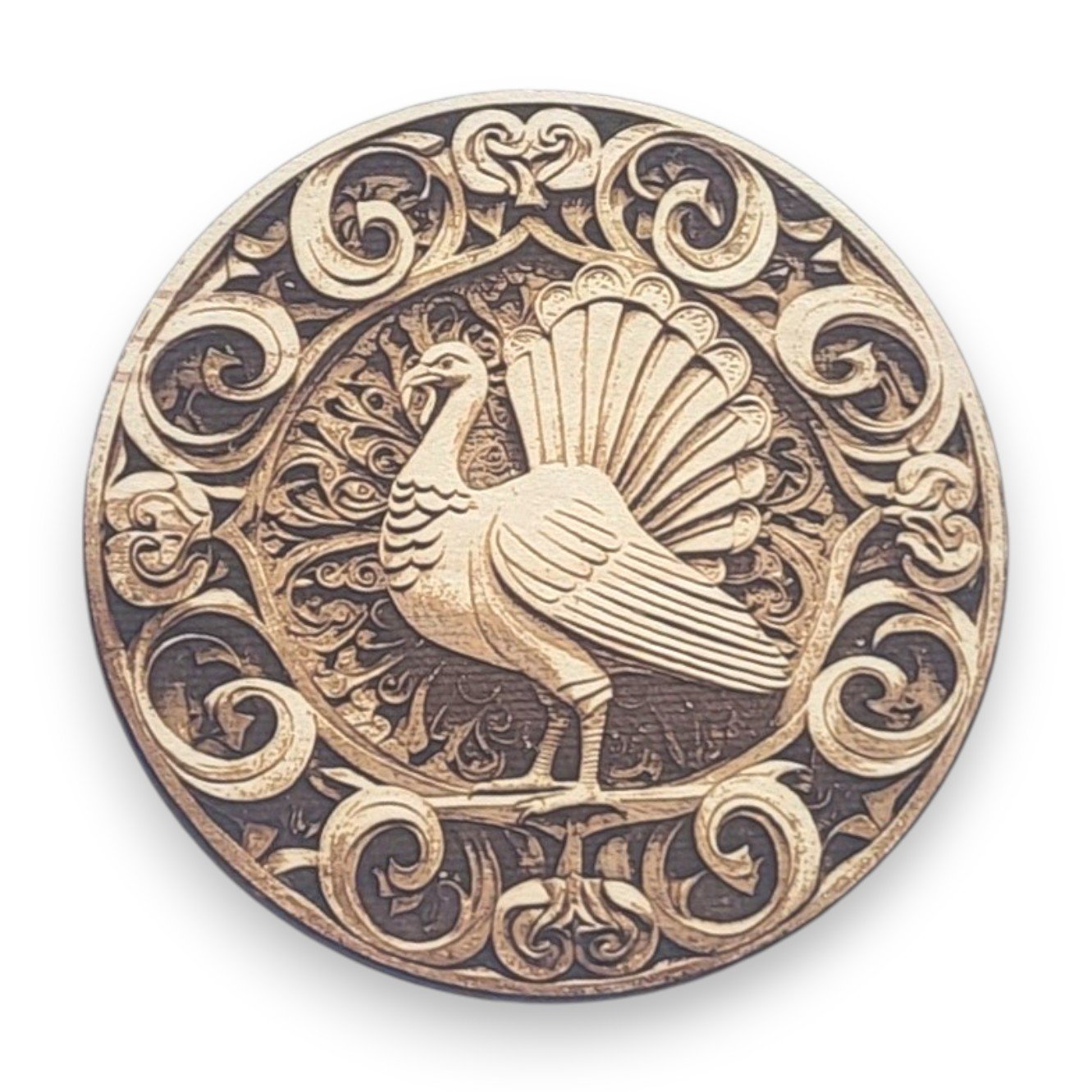 Celebrate the beauty of wildlife with this 3.5-inch round wooden ornament, featuring an intricately engraved wild turkey surrounded by elegant filigree detailing along the outer edge. This ornament captures the spirit of nature and adds a unique, rustic touch to your holiday decor.